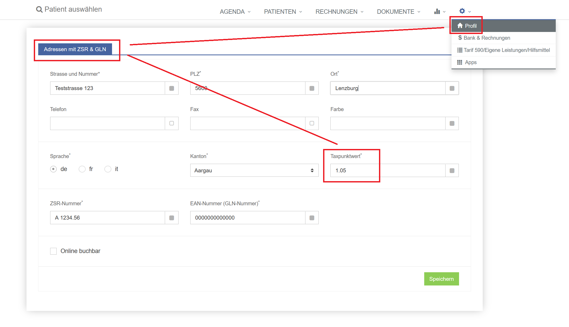 Um wieder mit dem alten TPW von 1.05 abrechnen zu können, kann auf der Adresse unter "Profil" der alte Taxpunktwert von 1.05 hinterlegt werden: